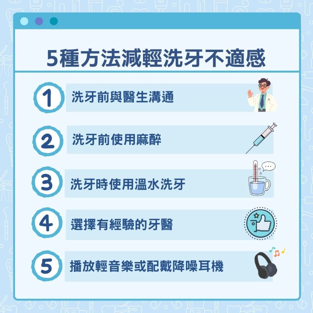 在洗牙前可以主動向牙醫說明你是否對疼痛比較敏感或有牙齒敏感的狀況,醫生會根據狀況調整洗牙的力道、水溫和方式,或使用其他輔助方式來舒緩。