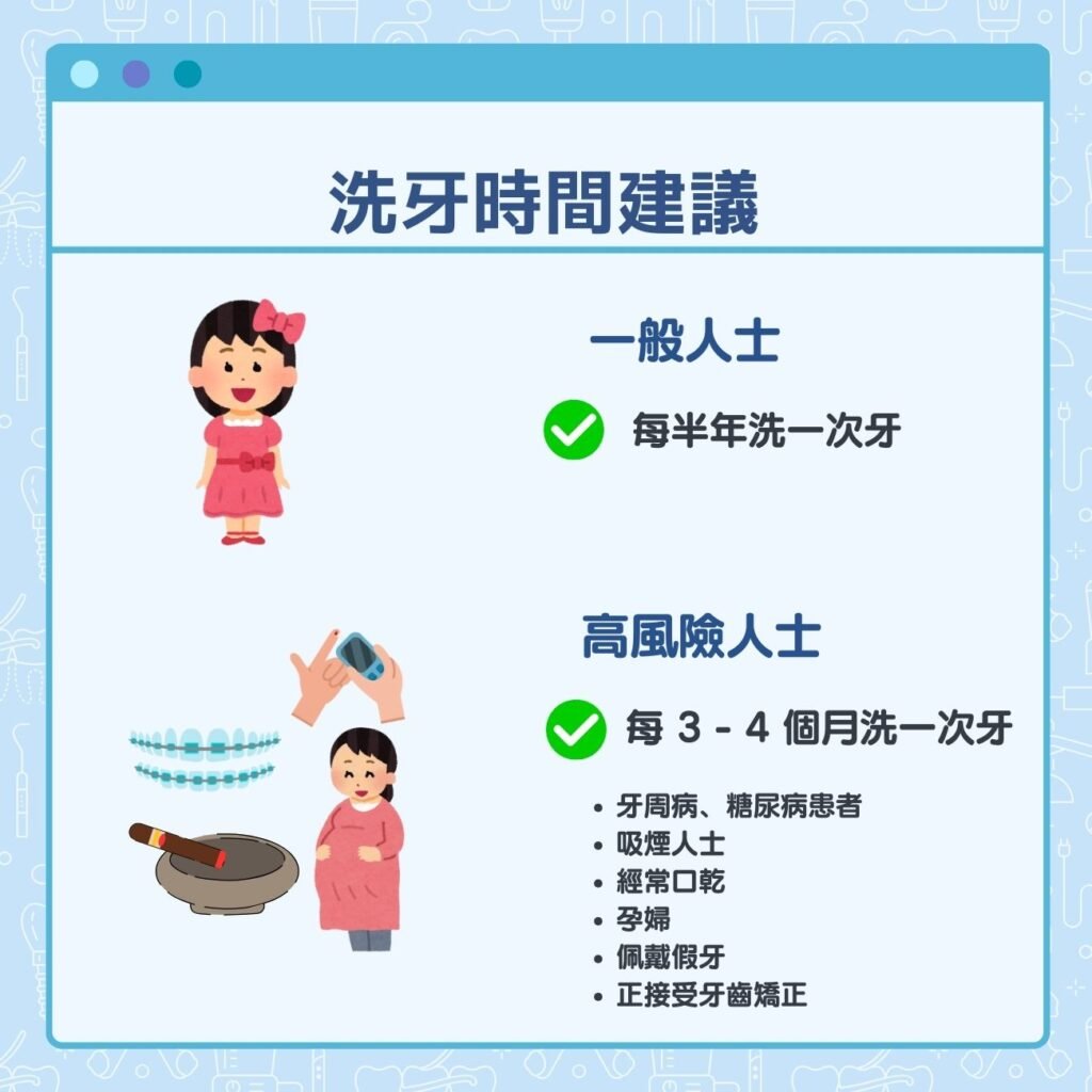 一般人建議每半年洗牙一次,若有牙周病、糖尿病或吸煙習慣,建議每三個月洗牙一次,才能有效維持口腔健康。
